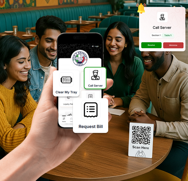 Guests scan table-specific QR codes for personalized menus, allergy notes, and order tracking.